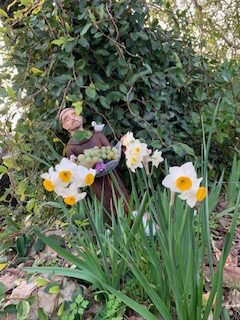 Now, here’s those manzanita and acacia flowers I promised, plus a very California-looking Franciscan (I’m guessing … not my area of expertise) hiding behind some amazingly fragrant freesias.